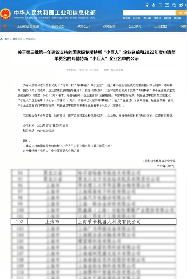 5月17日,工业和信息化部中小企业局公示了关于建议支持的国家级专精特新“小巨人”企业名单(第三批第一年),节卡机器人成为上榜的20家上海企业之一。这也是节卡机器人继获得上海市科技小巨人、国家级专精特新小巨人企业之后,发展与成长的第三次进阶。