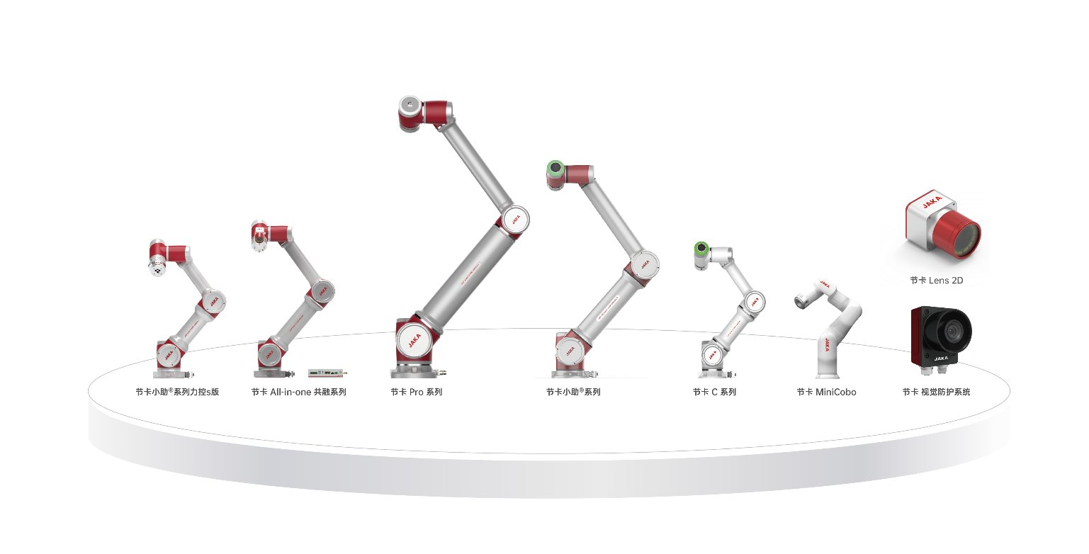 具体到产品上,节卡机器人接连推出JAKA Zu系列协作机器人(通用版,力控s版)、All-in-one共融系列协作机器人、C系列协作机器人、JAKA Pro系列、MiniCobo商用协作机器人、节卡Lens系列视觉等产品,均具有良好的通用性与柔性特点,可轻松应用于各行业领域,并满足不同场景应用需求。