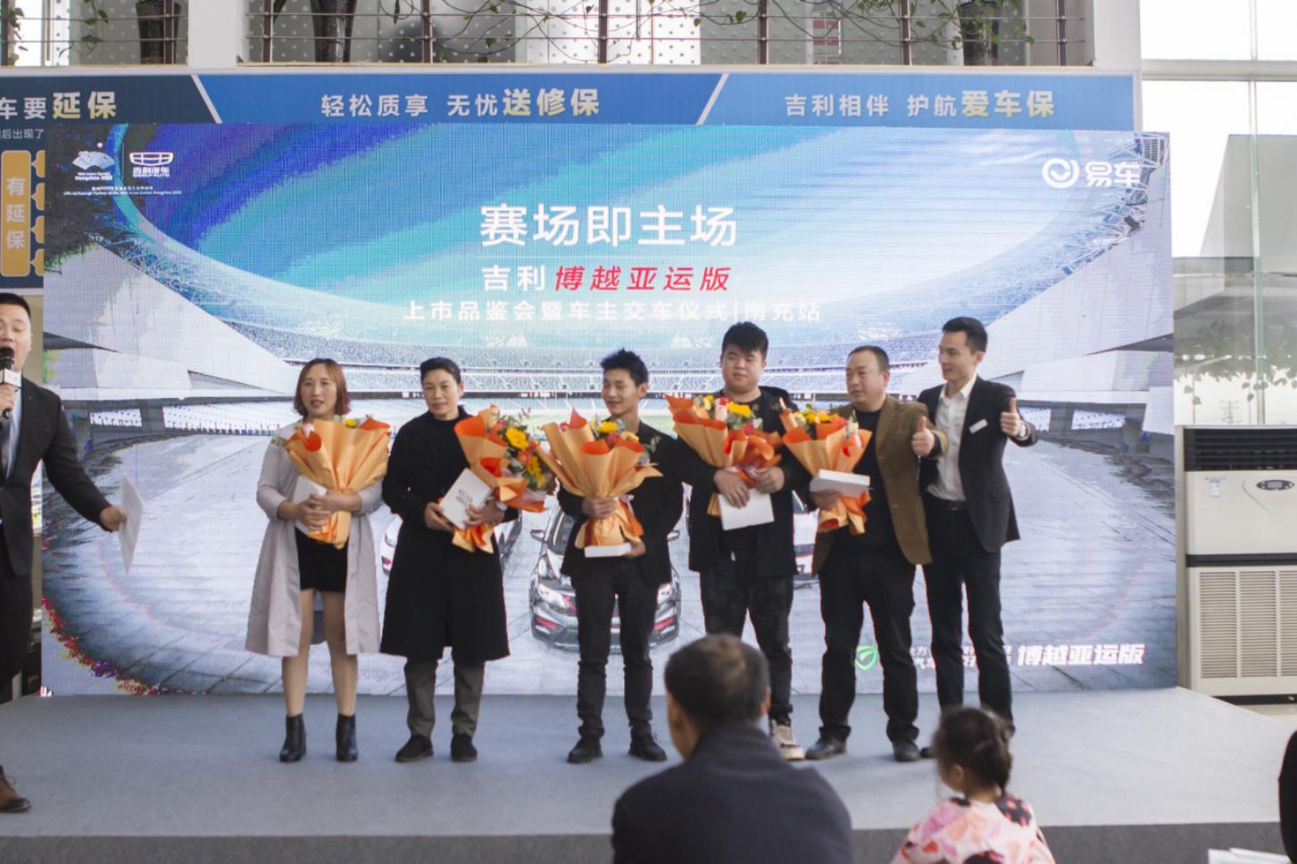 活动现场,我们也盛情邀请到了五位尊贵的博越亚运版车主朋友的莅临,作为我们的首批车主代表,一起共同见证博越亚运版C位出道,并同时为博越亚运版的上市带来了特别的祝福,感谢大家对吉利汽车的支持与信赖。南充圣奇吉利4S店也为各位车主代表准备了鲜花与一份薄礼,祝愿他们未来的日子里吉利汽车能带给他们更多的美好与陪伴!