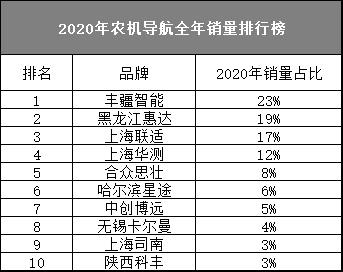 以上五家企业占据了农业用北斗终端总销量79%,剩下五家的排名为哈尔滨星途(6%)、中创博远(5%)、无锡卡尔曼(4%)、上海司南(3%)、陕西科丰(3%)。