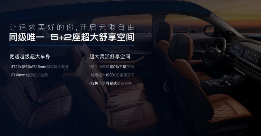 瑞虎8PLUS鲲鹏版有着4722x1860x1745mm越级超大车身,2710mm的越级超长轴距,从而塑造了“5+2座”的超大舒享空间,车内不仅有着12种灵活可变式组合空间,且具备34分贝的超强静谧性,配合头等舱式VIP坐席、自由调节航空舒压头枕,让用户一路惬意畅行。