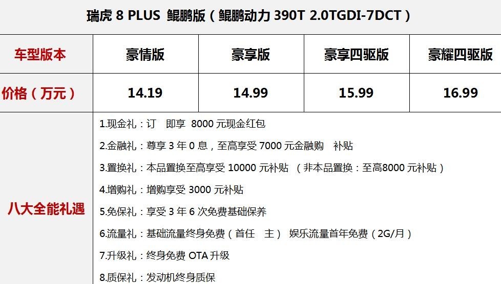 此次,瑞虎8PLUS鲲鹏版共推出4款车型,指导价14.19-16.99万元。同时,购车用户还能享受8000元现金红包、享3年0息、置换至高万元补贴、发动机终身质保等⼋⼤购车全能礼遇。首搭奇瑞全场景智控四驱系统,并配备鲲鹏动力2.0TGDI发动机、C-PURE净立方绿色座舱等全能配置为用户带来更加美好的用车体验。