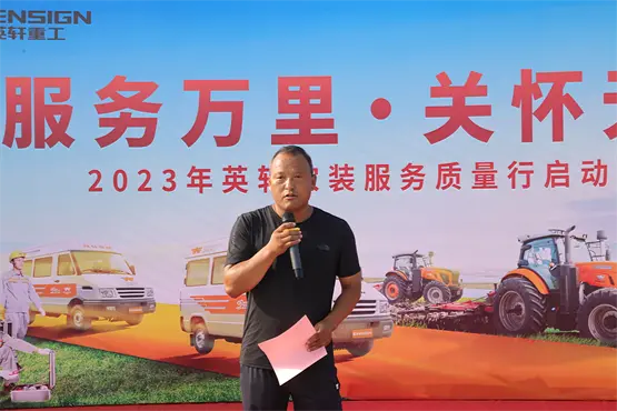 活动伊始,英轩重工农装事业部总经理陈敏革对活动作出指示并充分肯定了本次活动举办的重要意义。他指出,近年来英轩农装积极响应国家政策要求,对产品进行环保升级,国四产品大量投放市场对于用户来说处于摸索阶段。为更好服务用户,解决用户使用过程中出现的问题,陈总要求各服务团队要将本次活动意义落实到实处,发扬“快、准、狠”的风格,切切实实为客户解决疑难问题,真正做到让用户满意,这是本次服务质量行的宗旨所在!